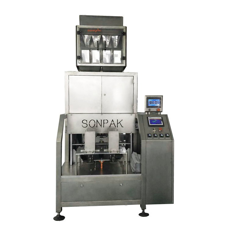 1、該真空包裝機將成品袋按順序放到指定袋庫,該機自動完成:取袋-開袋-裝料-整形-抽真空-封口-成品送出。